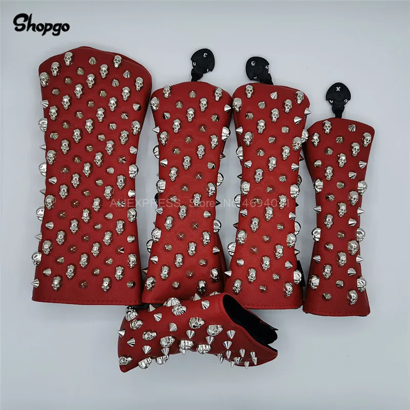 ORIGINAL [Silver Skull Rivets] Red PU Golf Driver Headcover Fairway Woods Hybrid Putter Club Covers Complete