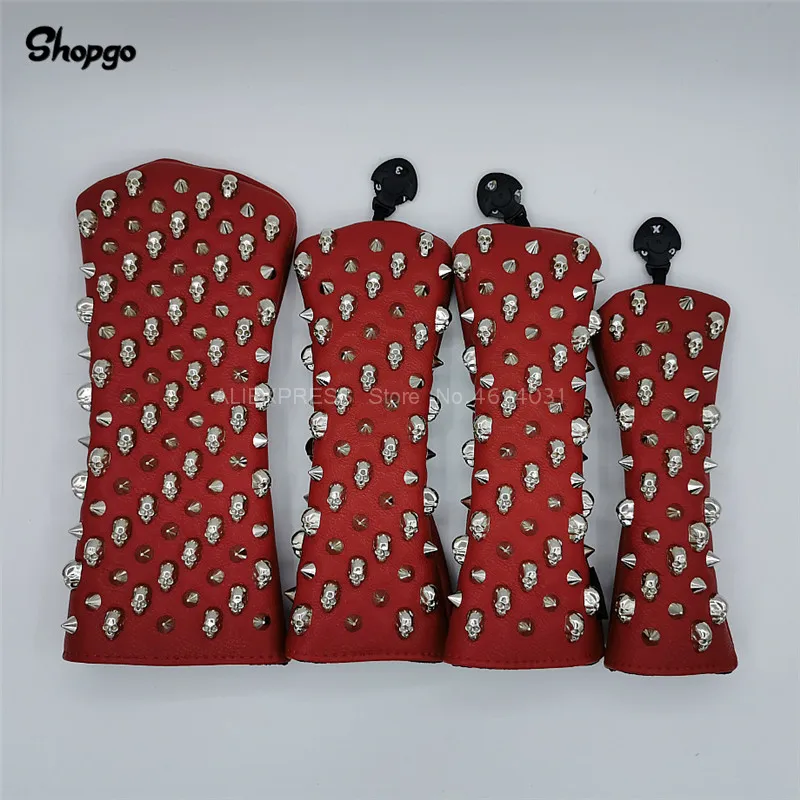 [Silver Skull Rivets] Red PU Golf Driver Headcover Fairway Woods Hybrid Putter Club Covers Complete
